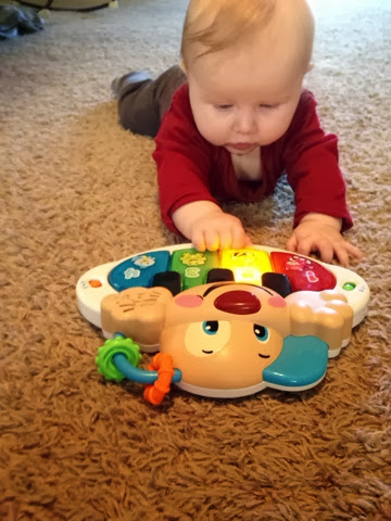 She's a big wiggly mess most of the time. She needs to stand or jump when you hold her. When she's on the ground playing she starts out upright, moves to the crawl position, flops to her belly and then rolls to every toy around. We aren't crawling yet, but I'm sure it will be soon. Then my life will be flipped upside down.